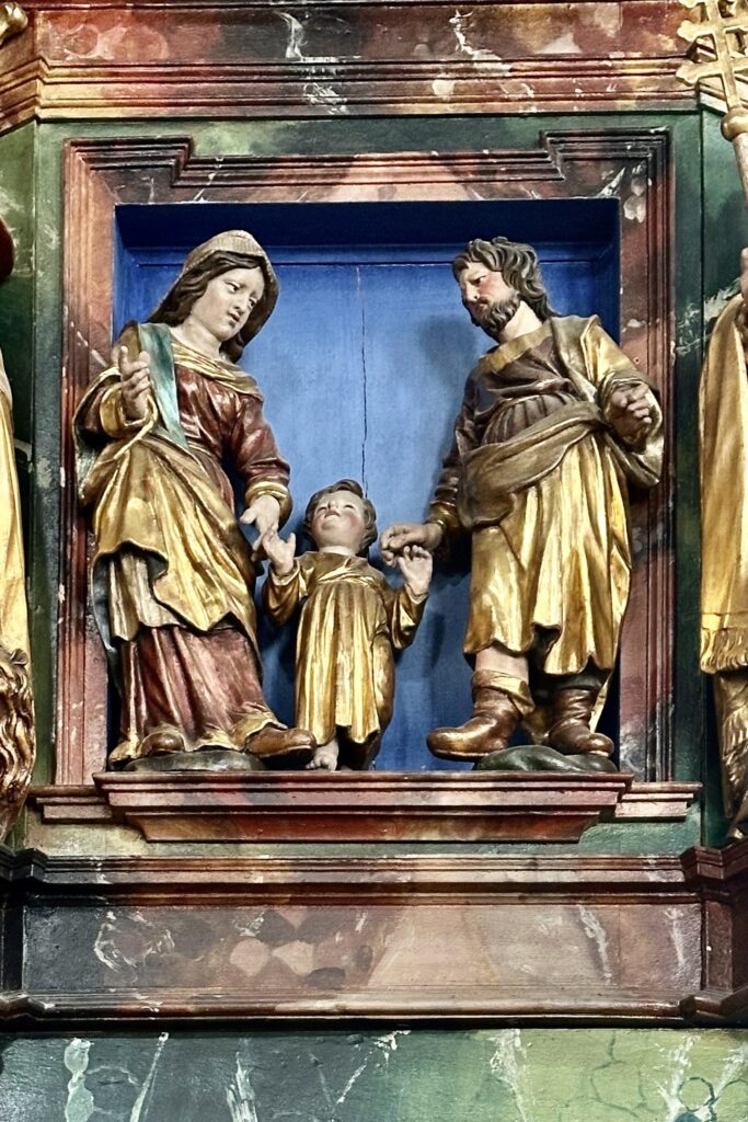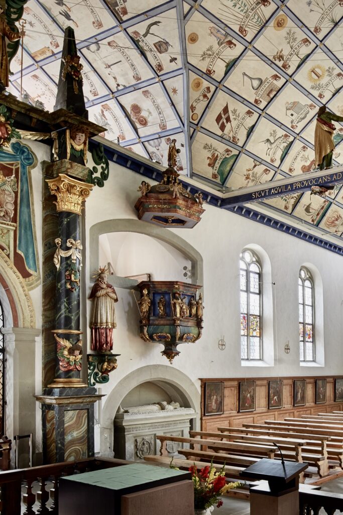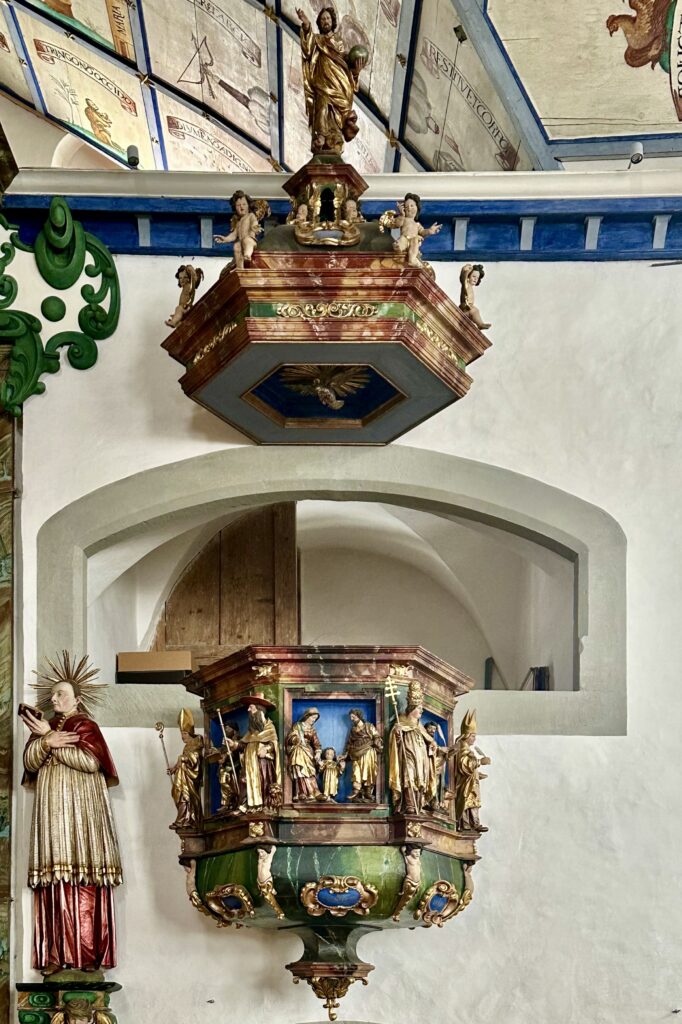 Früher predigten die Geistlichen von der hölzernen Kanzel (1660/62) an der rechten Langhauswand, hoch über dem Kirchenvolk und vor der eindrücklichen Kulisse aus bunten Altären und Sinnbildern.