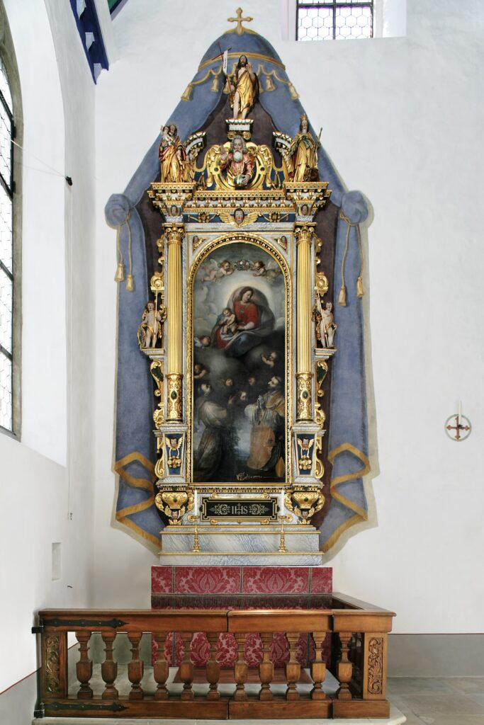 Links steht der Franziskusaltar. Das barocke Altarbild zeigt Franz von Assisi (links) in einem «heiligen Gespräch» (Sacra Conversazione) mit dem hl. Karl Borromäus (rechts) vor der Himmelskönigin Maria (oben).